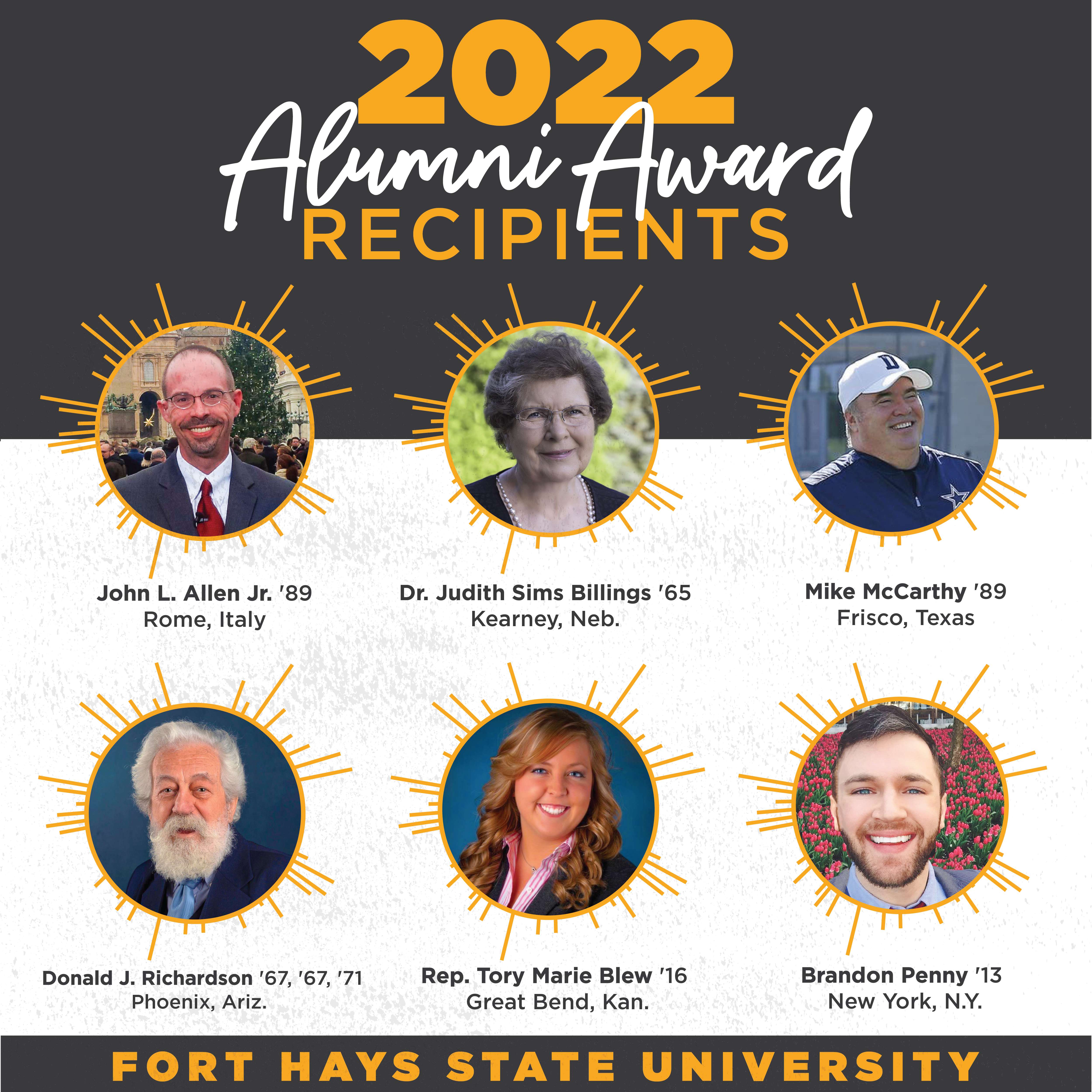Six Fort Hays State University alumni will be honored on Friday, Oct. 7, 2022, at the Alumni and Friends Awards Banquet during Homecoming. For details on how you can help celebrate these award winners during FHSU’s Homecoming, visit www.FHSUHomecoming.com.
