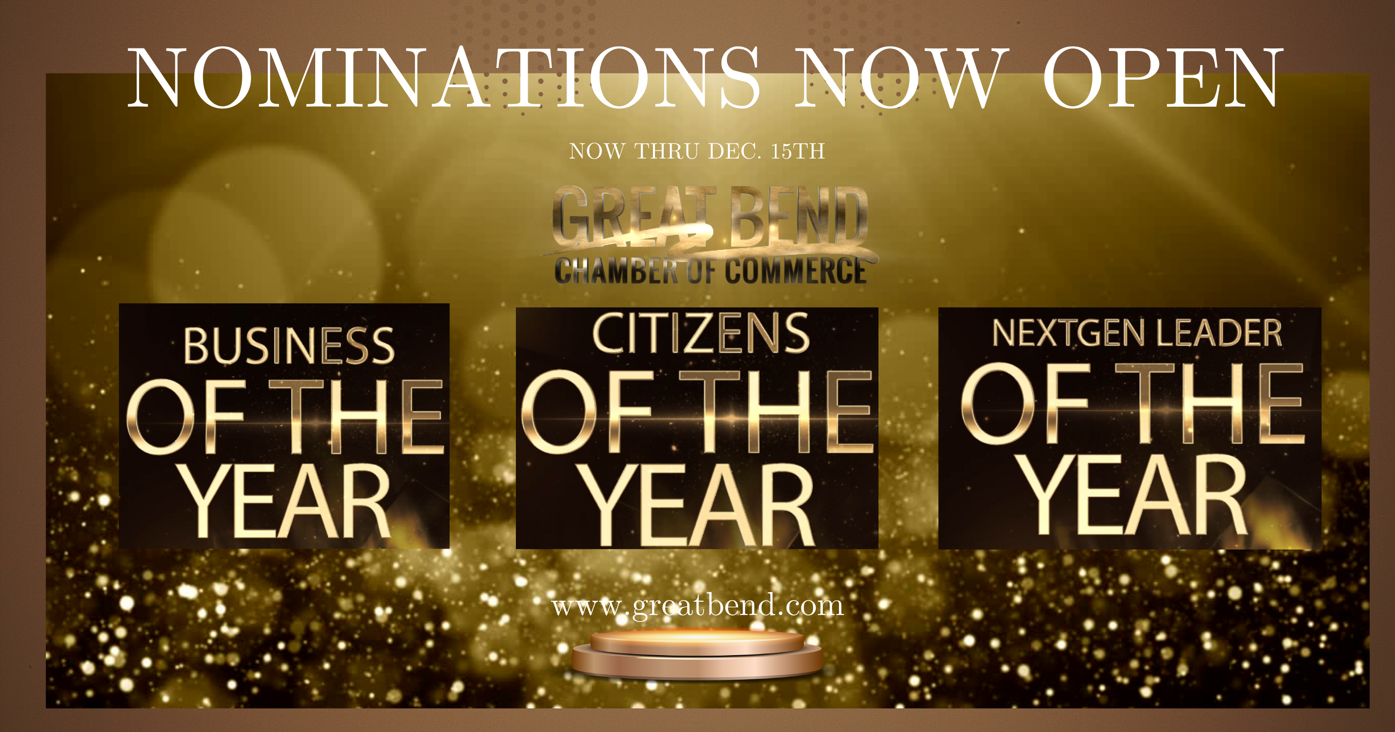 The 102nd Annual Great Bend Chamber of Commerce Awards is scheduled for Saturday, Feb. 24, 2024 at the Corinthians Hill Event Center. Join the Chamber in celebrating the community’s finest by submitting your nominations for the Chamber’s annual awards.