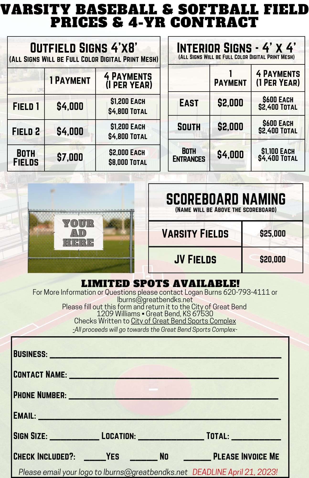 In late March, the City of Great Bend announced that individuals or businesses that wanted to advertise at the Great Bend Sports Complex now have multiple opportunities with outfield signs, scoreboard naming and signs throughout the facility. Any money raised from the sponsorships will go toward upgrades and maintenance and the capital improvement fund for the Sports Complex.