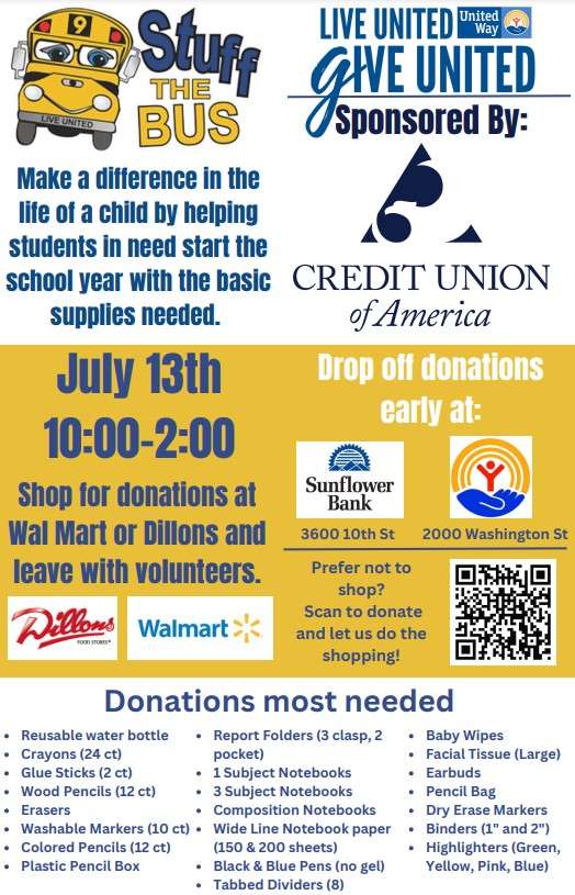 United Way of Central Kansas is preparing to Stuff the Bus again this year. The date is set for this Saturday, July 13, from 10 a.m. to 2 p.m. at Walmart and both Dillons locations in Great Bend.