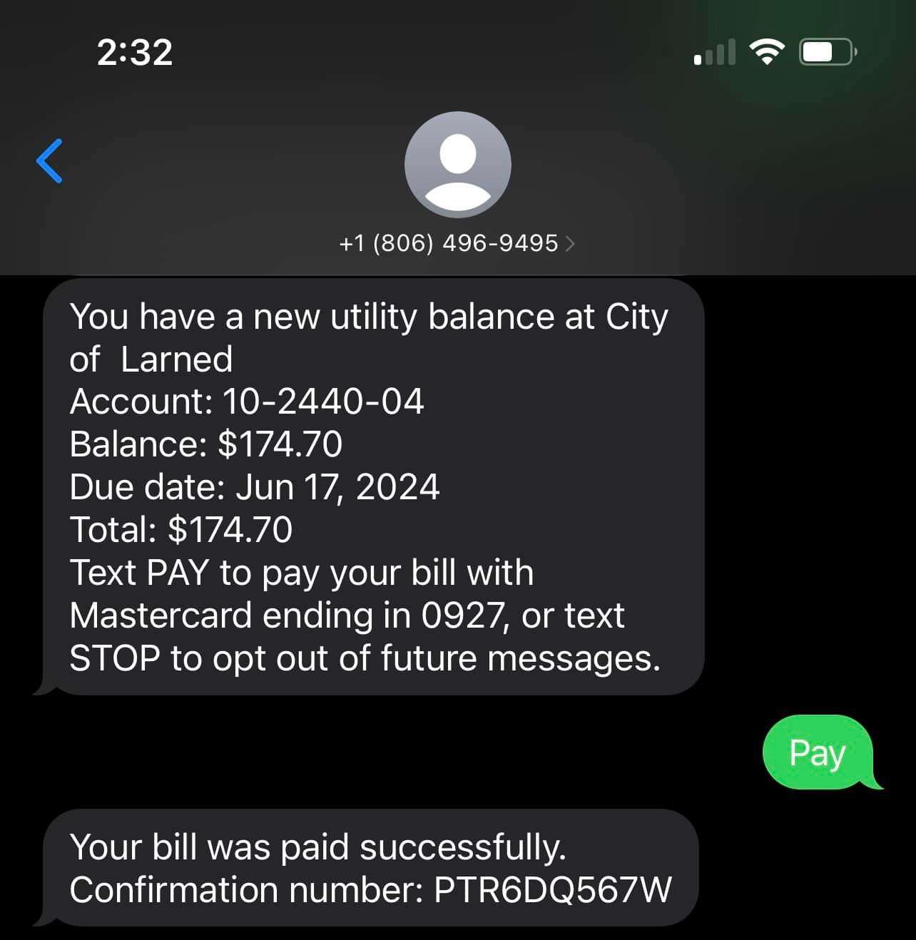 The City of Larned announced that the city now has a text-to-pay option available for customers. Residents can call 877-785-8317. you will need your account number and the card you wish to have the payment taken from. Listen to the prompts for a quick set up. You will then get a text to verify your account and you will also receive text alerts when your bill is available to pay.