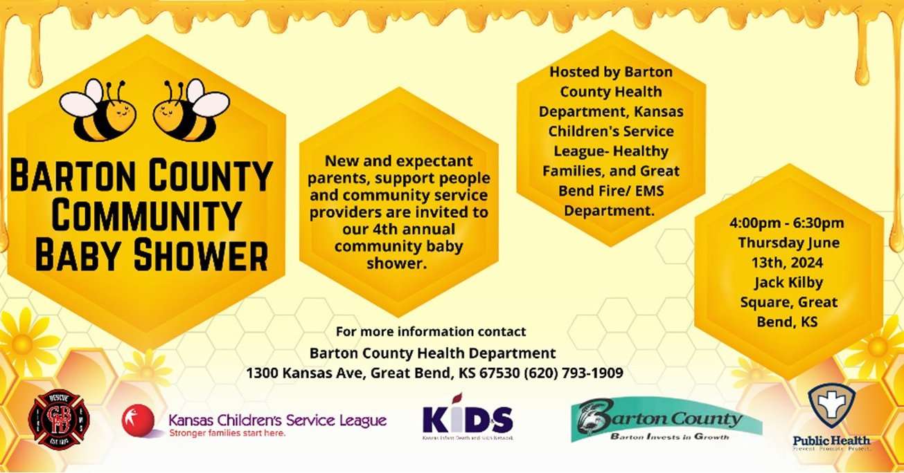 The Community Baby Shower, which runs from 4-6:30 p.m. near the bandshell at Jack Kilby Square, is hosted by the Barton County Health Department, Kansas Children's Service League-Healthy Families, and the Great Bend Fire Department.