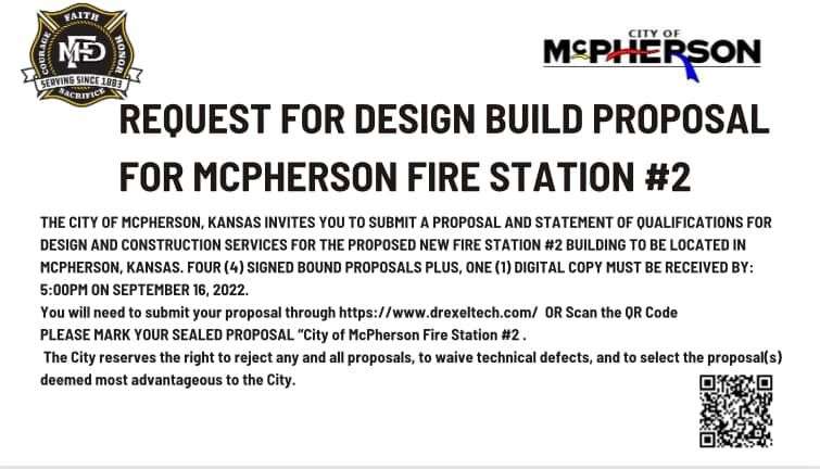 The City of McPherson is seeking requests for proposal for its new Fire Station #2. Design and construction services RFPs are due Sept. 16.