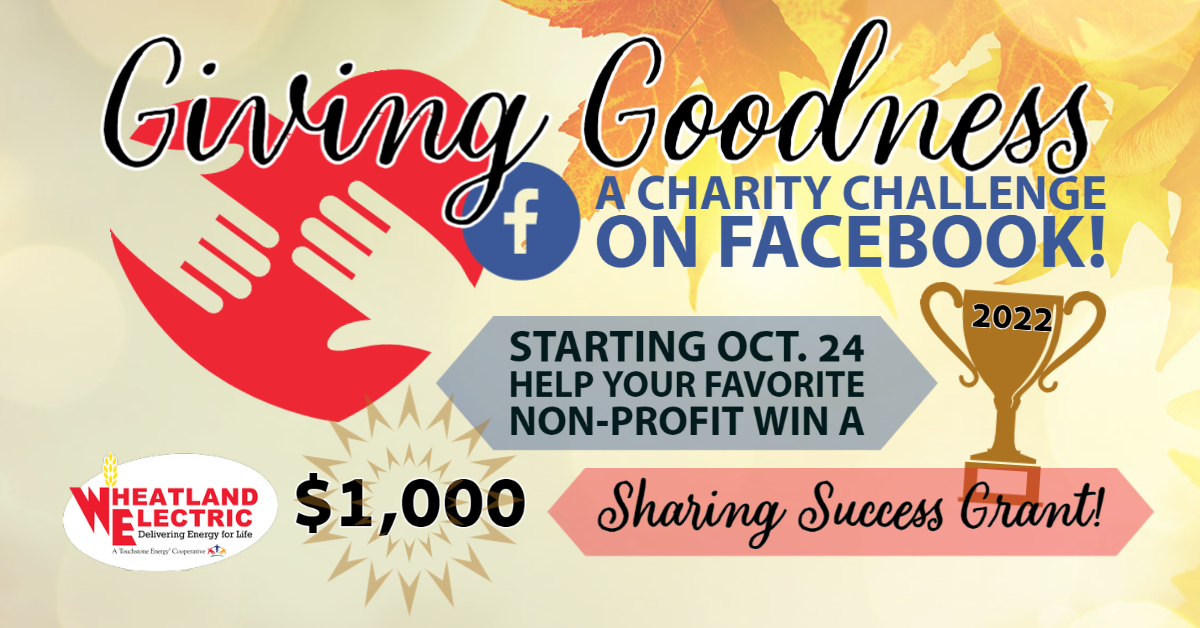 Giving Goodness, a social media charity challenge, begins 8 A.M. CT on Monday, Oct. 24, and will run through 11:59 AM CT on Nov. 10, 2022. The public challenge is run entirely on the cooperative’s official Facebook page: https://www.facebook.com/WheatlandElectric/.