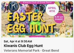 The annual Easter Egg Hunt sponsored by the Great Bend Kiwanis Club is set for 9:30 a.m., Saturday, April 4th at the Kiwanis Walking Trail on the north side of Veterans Park in Great Bend. There will be lots of Easter eggs scattered throughout the park for children to find. The event is free and open to area children pre-school through 6th grade. The Easter Bunny will also be there. Parents and children are asked to remain in cars until the event starts at 9:30 a.m.